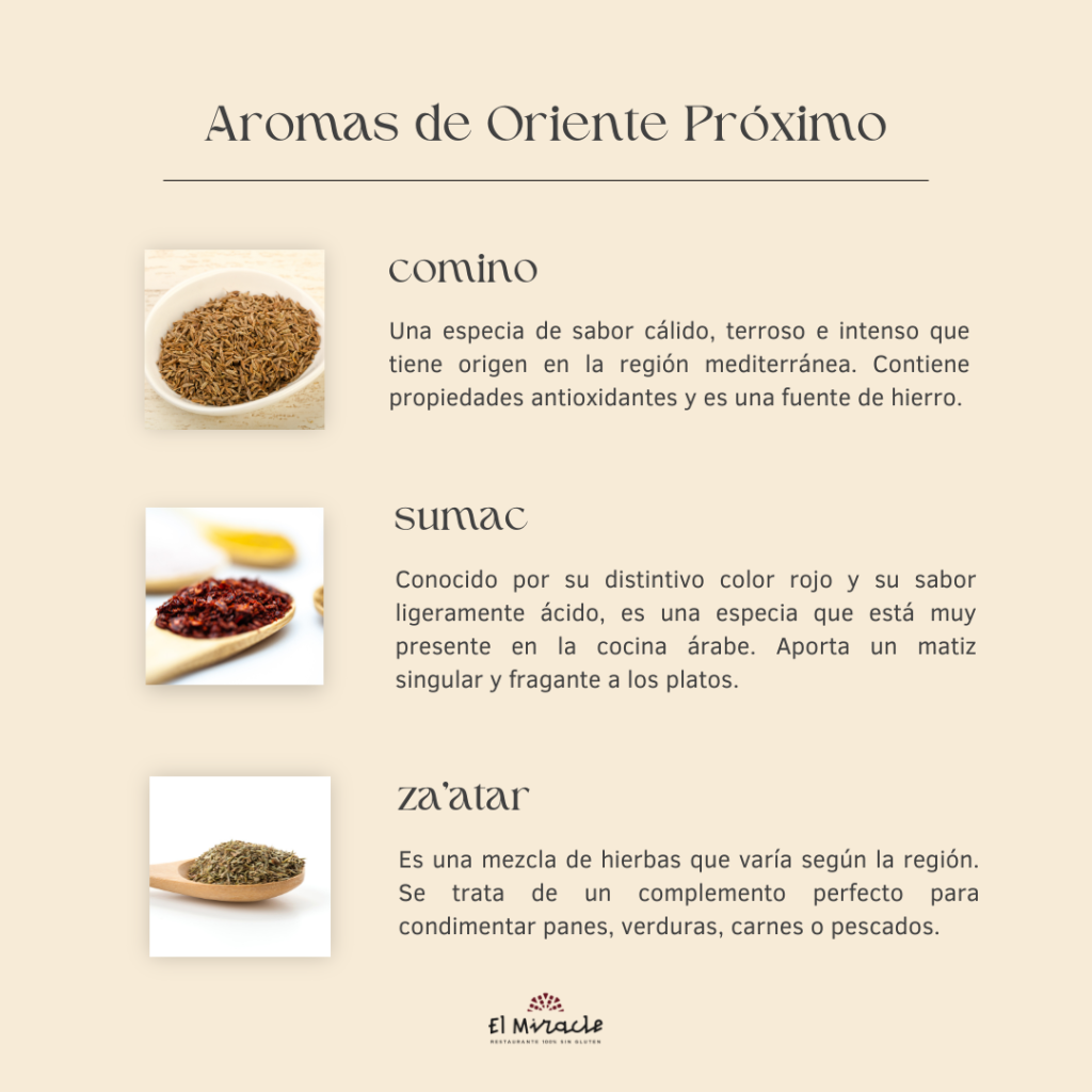 Muchos sabéis que El Miracle es un restaurante con el corazón puesto en Siria y nuestros platos tienen influencia de la cocina mediterránea y de Oriente Próximo. Por ello, como no podía ser de otra manera, las especias son protagonistas en nuestra carta 100% sin gluten.