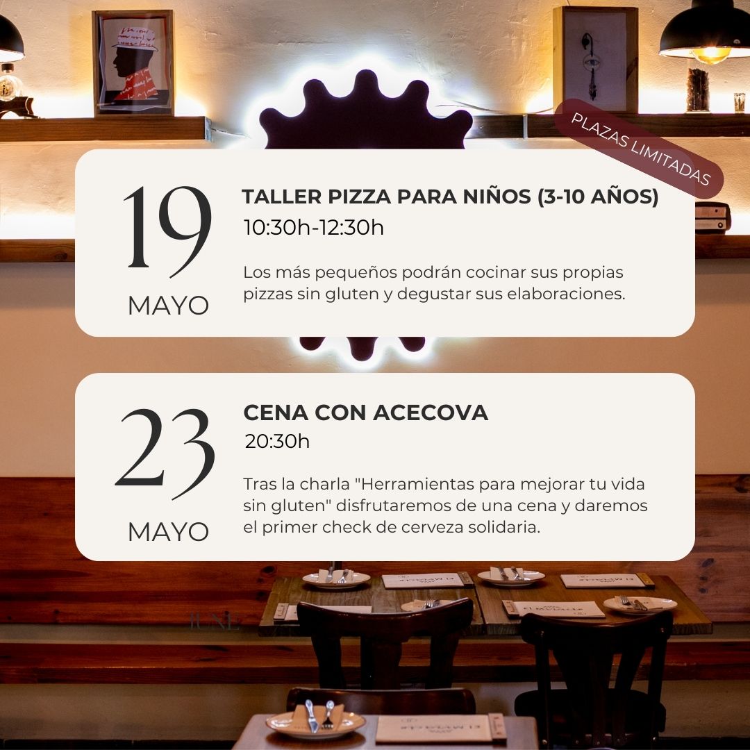 ¡Atención a todos los padres y madres con peques amantes de la pizza y la diversión! Nuestro taller de pizza sin gluten se llevará a cabo el domingo 19 de mayo, de 10:30h a 12:30h, en nuestro restaurante. Una oportunidad perfecta para que los niños se diviertan elaborando sus propias pizzas sin gluten y luego puedan disfrutarlas en buena compañía.